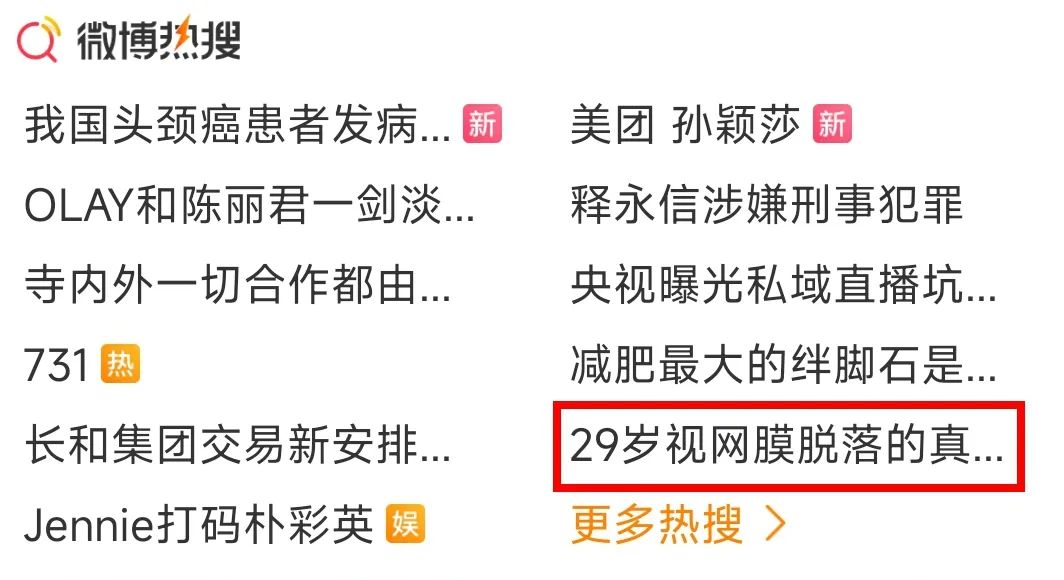 昨日,#29岁视网膜脱落的真实经历#这一话题登上热搜,引发了众多关注。博主阿丹分享了自己视网膜脱离术后一年半的情况,为我们敲响了爱护眼睛的警钟。